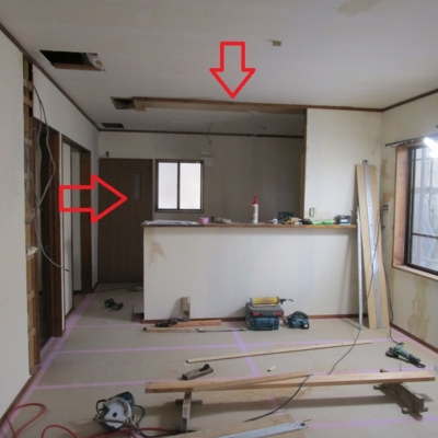 野田町中古住宅の内部造作中です。 まずはキッチンの吊戸棚の壁と キッチン脇にあった壁を撤去しました。 閉鎖的で暗かったキッチンがオープンキッチンに変わります。 床も新しいフローリング材を張りました。 (養生しているので、 […]