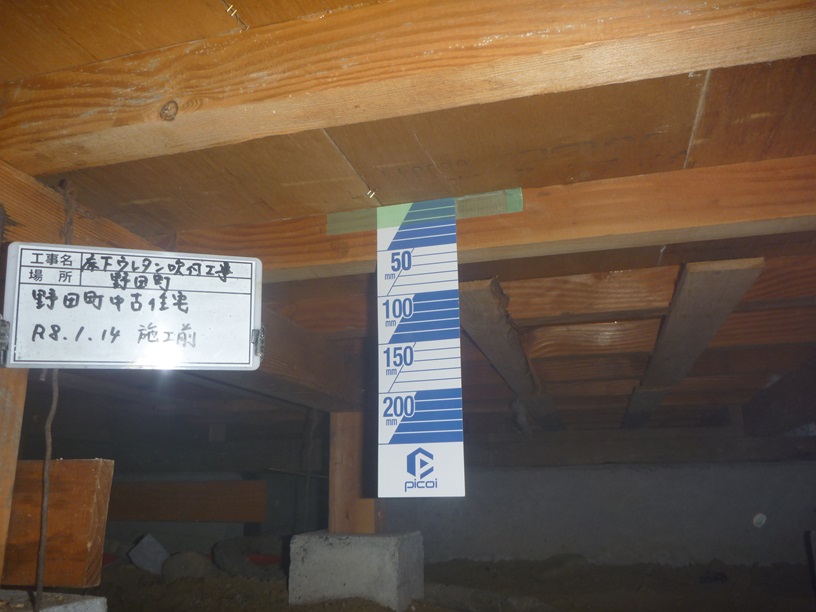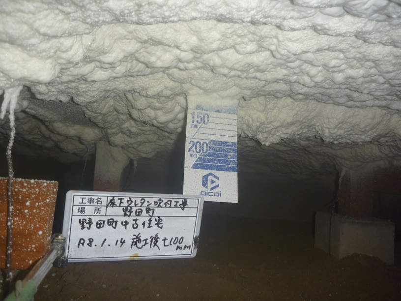 野田町中古住宅の 床下に断熱材のウレタン吹付工事を行いました。
