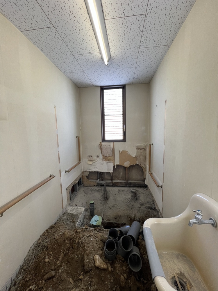 次にトイレの壁や床を解体します。 築年数が40年の建物なので、配管が痛んでいる部分が多々あります。 痛んでいる配管部分は撤去し、新しい配管に入替を行います。